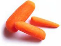 Small, fresh peeled carrots that offer convenience and ease of use as a vegetable. Baby carrots are ready to eat out of the bag, making this food a quick and easy snack or a good choice for use on an appetizer tray. Baby carrots are not grown as small carrots, but are actually long, narrow carrots that are cut and shaped into the smaller size.