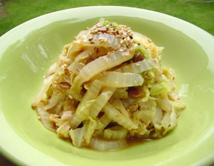 Take the leaves out from the cabbage, slice it, blanch in a water for 2 minutes. Transfer to a cold water bath, and drain. Squeeze with hands, put in a bowl.
