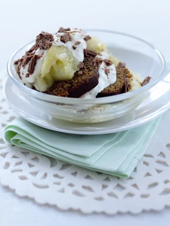 - Spoon a little of the apple purée into the base of 4 glass bowl, top with a slice of ginger cake, then more apple, a spoon or two of cream and chocolate flakes.