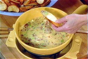 - Transfer fondue to a fondue pot and set over a low flame.