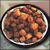 Heat 2 tbsp of oil in a pan. Fry the mustard seeds and cummin seeds, till they splutter. Add the green chillies, coconut, salt, Raisin and cashew nuts. Fry for 5 minutes. Let the mixture cool. Dry grind the bread slices. Add to the mashed potatoes, salt and bread powder. Mix well to make a soft dough.
