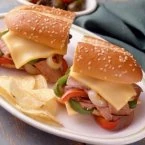 Per Sandwich: Calories 740, Fat 28 g, Cholesterol 90 mg, Sodium 2140 mg, Carbohydrates 89 g, Dietary Fiber 6 g, Protein 33 g