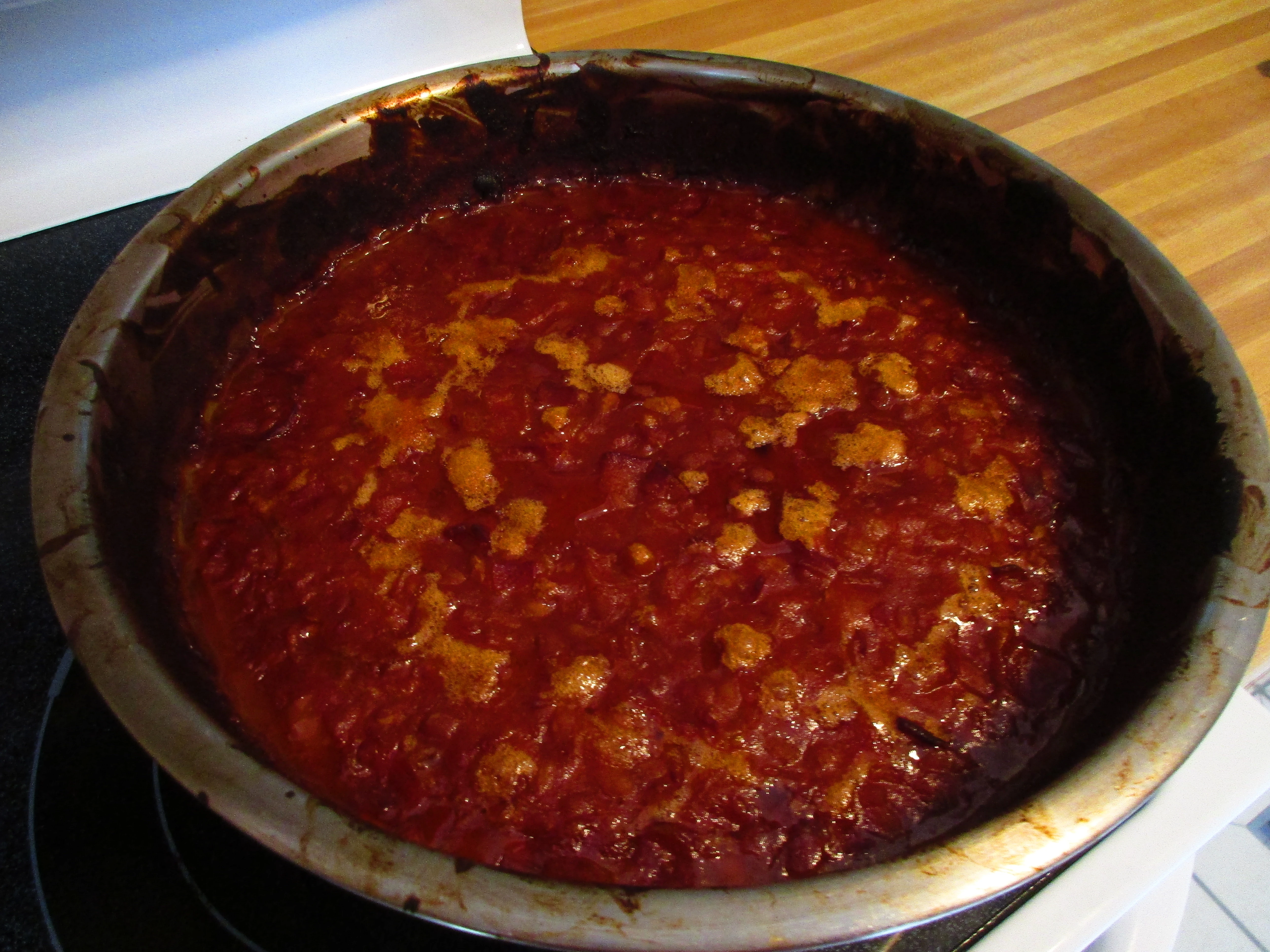 Bake uncovered in a slow oven at 325 degrees Fahrenheit for 3 hours. Remove from oven, stir well and return to the oven for 1 more hour for a total cooking time of 4 hours. The mixture should be boiling and have a thin layer of liquid bacon grease and a slight film on top. The bacon at the outside edges of the baked bean mixture can burn, if baked for over 4 hours at 325 degrees Fahrenheit. Mix well before serving.