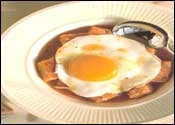 Pour the vegetable stock into a pan. Add the garlic, paprika, cumin and bring to a boil. Season. it. Break the toast into cubes and put into the hot soup bowls. Place a pan on the heat, lightly oil it and fry the eggs until the white forms. Tip out one egg into each soup bowl and pour over the boiling soup.