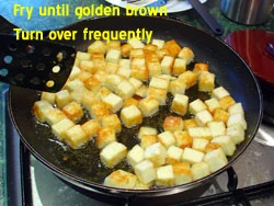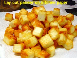 Heat up a couple of tablespoons of veg oil in a frying pan until hot and then add the cube sof paneer and fry until golden brown - turning over frequently to ensure even browning.