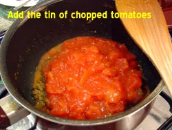 Then when the spices are infused int he Onion mixture - and the oil begins to separate from the onions - add the tin of chopped tomoto - and stir around on highish heat for a few mins.