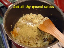 Then add the chopped onions and fry until goldeny-brown. After which add the ground dry spices and fry some more for about 5 mins gently.