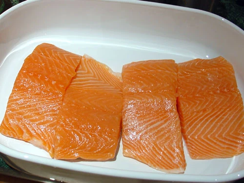 I was browsing around our local Safeway on Sunday afternoon - just before it closed - and noticed that the prices of fresh fish seem to plummet in the closing hour. I think this has something to do with the weekly replenishment cycle being Monday to Monday? Anyway - I bought myself some fresh fillets of supposedly Scottish salmon - no bone - but with the skin intact on one side.