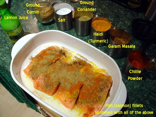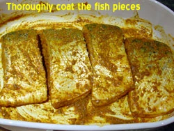 Not shown in the photo above is a very important first step: pour on (liberally) some olive oil into the dish with the fish pieces. Then shake on the concentrated lemon juice - plenty of it. Then simply use a teaspoon to sprinkle on some of each spice: 1 teaspoon of each, except the garam masala: use 2 teaspoons of this. When you've sprinkled on all of the spices - it should look something like in the picture above.