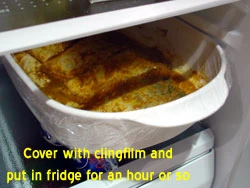 Now is the fun bit: using your hands - make sure that each fish piece is thoroughly coated with the spice mixture - ensuring that the powder dows not "clump" together at all - use the fish pieces to evenly mix the spice/lemon-juice/oil mixture. Then finally - place the fish pieces "face down" - i.e. skin side up and cover the dish with clingfilm. Place this in the fridge for an hour or two - that will give you plenty of time to get on with other things that you need to do.