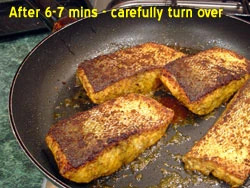 After about 6 mins - use a spatula or tongs to carefully turn over each fish piece so that the skin-side is now up. You can see that it is beginning to look quite good now. You may reduce the heat a bit at this point - because by cooking the fish on high heat with skin-side down you have actually very gently cooked the fish right up to the top of the fish - and all you want to do now is to brown the top. However - be warned if you follow these instructions the salmon will be very tender and "just-cooked" in the middle. If you like your salmon very well done, i.e. very dry and flaky in the middle - then you may want to keep them cooking for a bit longer - or finishing off by microwaving the fish on high power for about 2 mins.