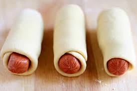 - Cut dough into 1½-inch-wide strips and roll a strip around middle of a frankfurter until dough just overlaps.