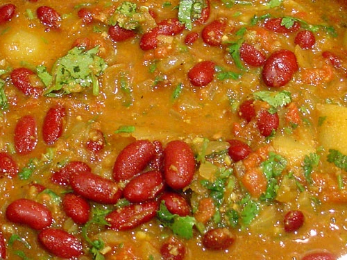 Kidney beans make an excellent nutritous basis for a vegetarian dish - and this is a popular Indian method for cooking them. Called "rajma" - the kidnet beans are cooked either on their own - or in this Punjabi variation - with potatoes.