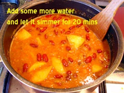 Then add the drained tins of cooked kidney beans. (MAKE SURE THEY ARE ALREADY COOKED kidney beans - as these beans are poisonous if not soaked in water overnight before cooking!). Then add some more water - perhaps a couple of glassed - and bring to boil and let simmer for around 20 minutes - with the lid off - so that the water slowly evaporates.