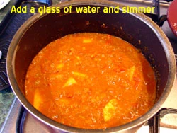 Then add the Potato chunks and give it a good stir around. Add a glass of cold water and bring to the boil - and let it simmer with the lid on for about 10 minutes. this will partly-cook the Potato.