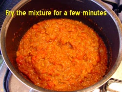 Fry the chopped onions in about 2 tablespoons of oil until slightly golden brown. Then toss in the garlic and ginger pulp - and fry for a few minutes more.
