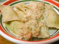 A common vegetarian option includes ricotta cheese and vegetables such as spinach or nettles in place of meat. The filling could be also potatoes, squash or even tofu. Though often topped with a red, tomato based sauce, the sauces are as varied as the fillings. Pesto, broth based and cream based sauces are also common.