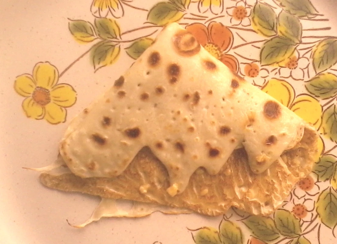 Appearance of the above roly-poly pancake after it has been folded once.