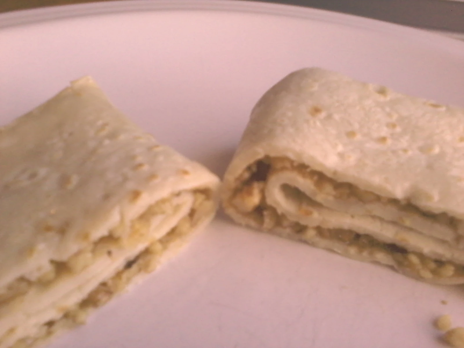 Folded roly-poly pancake with a filling of ground English walnuts, honey and margarine that has been cut open to show the layers. This pancake was made using unsweetened almond milk.