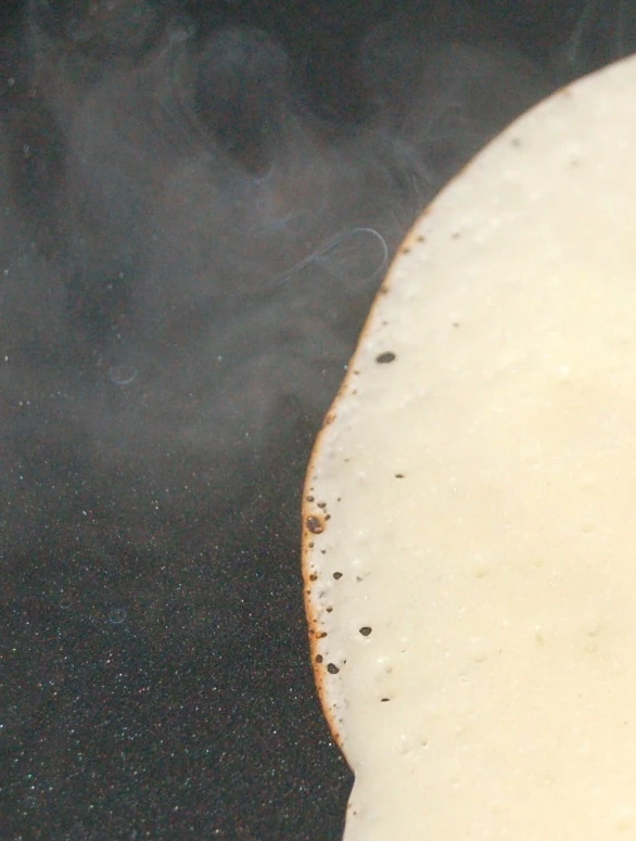 Appearance of the edge of a roly-poly pancake at the 55 second mark when it is ready to be flipped. This pancake was made with skim milk.